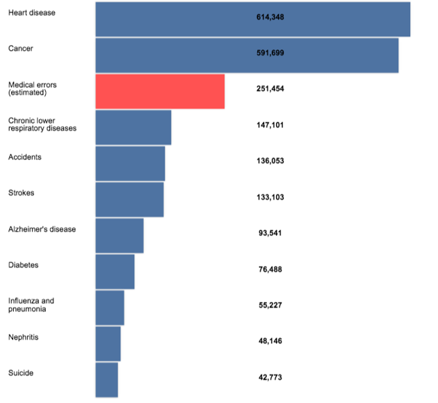 Based on an analysis of prior research, the Johns Hopkins study estimates that more than 250,000 Americans die each year from medical errors. On the CDC’s official list, that would rank just behind heart disease and cancer, which each took about 600,000 lives in 2014, and in front of respiratory disease, which caused about 150,000 deaths.